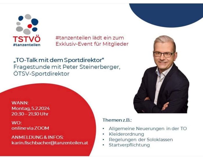 TanzSport-Magazin 23.08.2024 GOC 2024 – eine Tanzwoche der Superlative Schöne Erfolge für österreichische Teilnehmerinnen und Teilnehmer! 29.03.2024 Toller Erfolg in Cambrils WDSF Dancesport in Cambrils – WDSF World Championship Adult Choreographic Latin 20.02.2024 Es ist soweit ! 01.02.2024 ÖTSV Aktuell – der Sportdirektor Peter Steinerberger informiert 28.01.2024 Alljährliches Schulungswochenende 10.01.2024 Wolfgang Pribil verstorben 08.01.2024 Termin vormerken ! 05.01.2024 ÖTSV Winterkader 2024 27.12.2023 Arbeitsgruppe: Nachwuchs im TanzSport